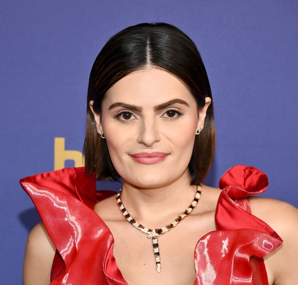 Mais um cabelo liso com risca central. Mas agora, em uma versão mais curta que as anteriores. As sobrancelhas expressivas ganharam protagonismo com a maquiagem bem natural e com pele de acabamento matte. A atriz de Bebê Rena está na categoria de Melhor Atriz em Minissérie.