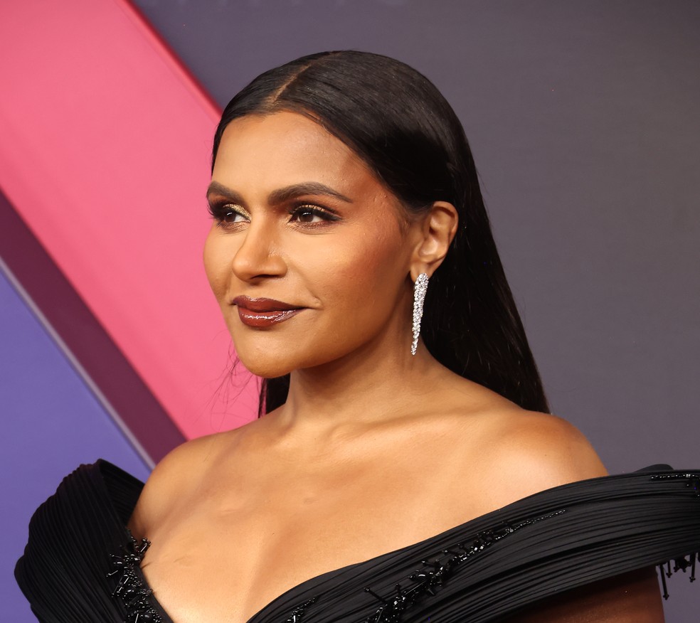 Mindy fez companhia à Laverne Cox na escolha do batom escuro para o 76º Emmy Award. No entanto, o acabamento escolhido foi bem glossy e o tom tinha um fundo mais avermelhado, dando um toque cereja. Nos olhos, ela usou uma sombra dourada nos cantos internos para abrir o olhar e deixar a maquiagem mais glamourosa. A atriz é a terceira da noite que usou o cabelo liso, chapado com divisão ao meio.